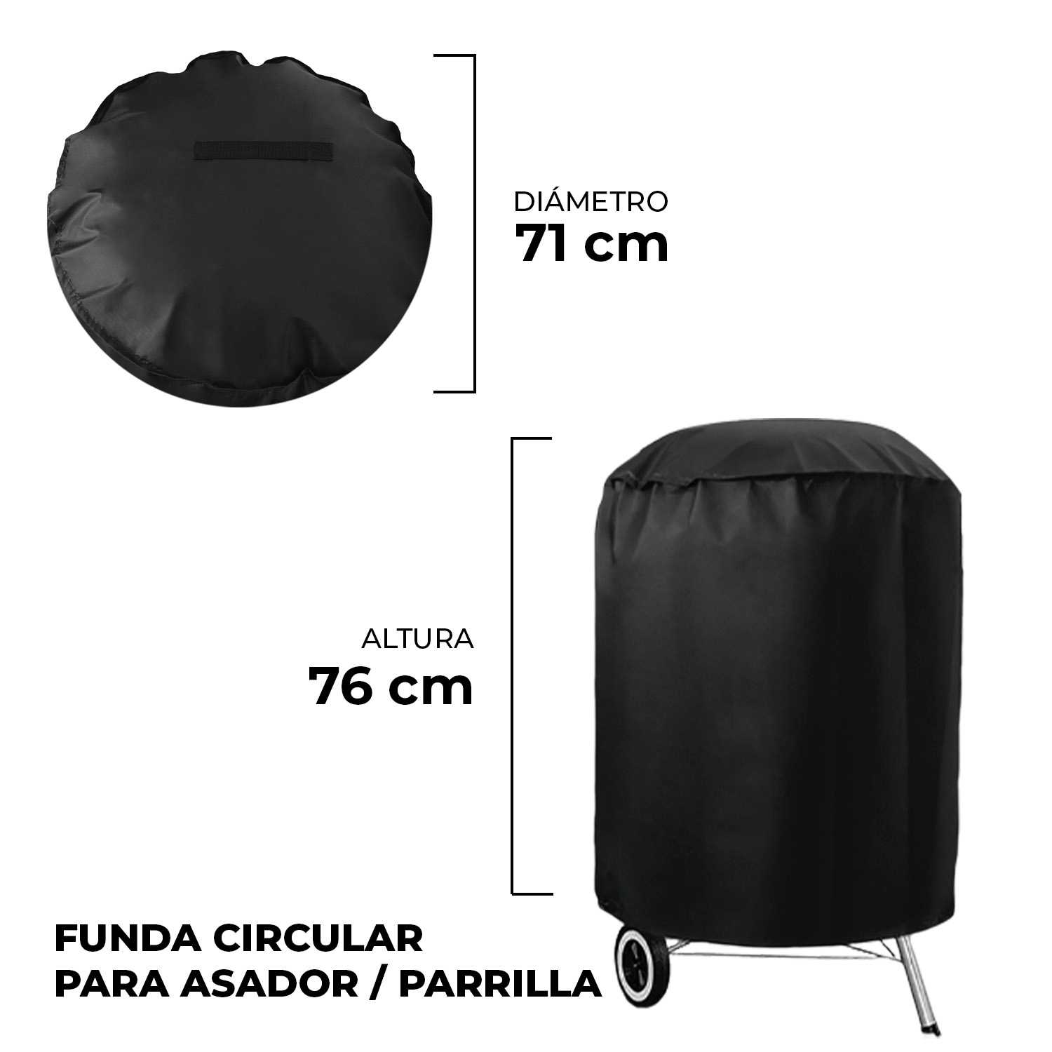 Con una medida de 76 cm x 71 cm de diametro, fabricada con materiales impermeables y resistentes, esta funda es ideal para resguardar tu asador contra polvo, rayos UV, lluvia y corrosión. Con un diseño ergonómico, es fácil de poner y quitar, brindando comodidad y seguridad.